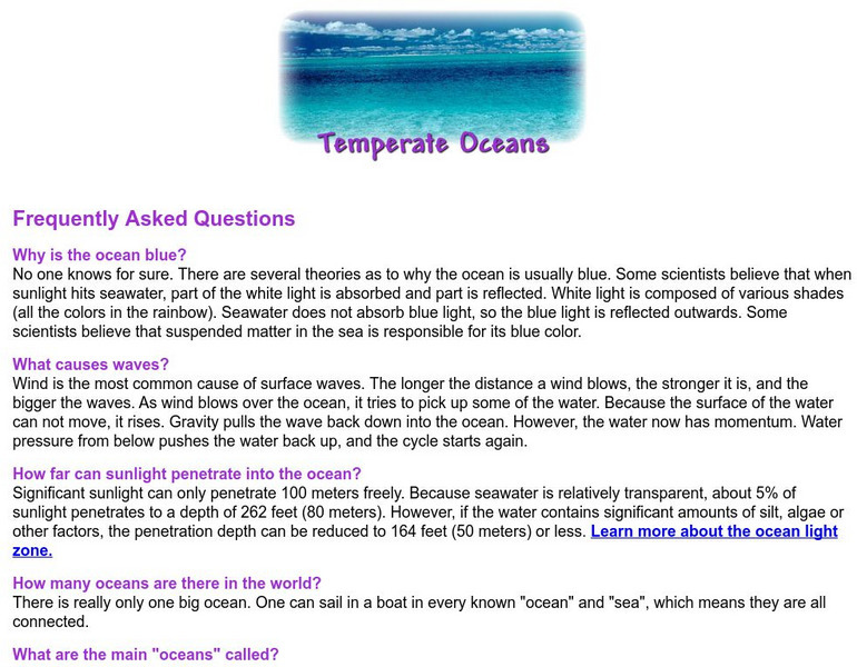 This site from the Missouri Botanical Garden is a comprehensive site covering various topics related to temperate oceans. Be sure to check out the ocean animals link on the left side to learn more about the invertebrates that live in the...