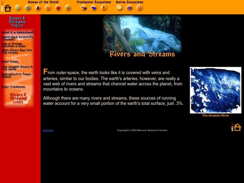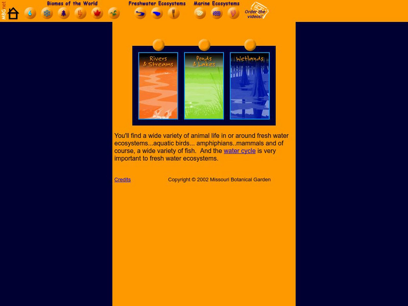 At this site from the Missouri Botanical Garden, you can learn about the wide variety of plant and animal life in or around fresh water ecosystems. Click on the links to "wetlands," "Ponds and Lakes," or "Rivers and Streams" to view...