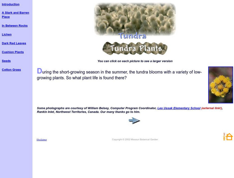 At this site from the Missouri Botanical Garden you will find information on the tundra. What is the tundra? Where is it located? What is the climate of the tundra? What animals live in the tundra? What plants live in the tundra? Click...