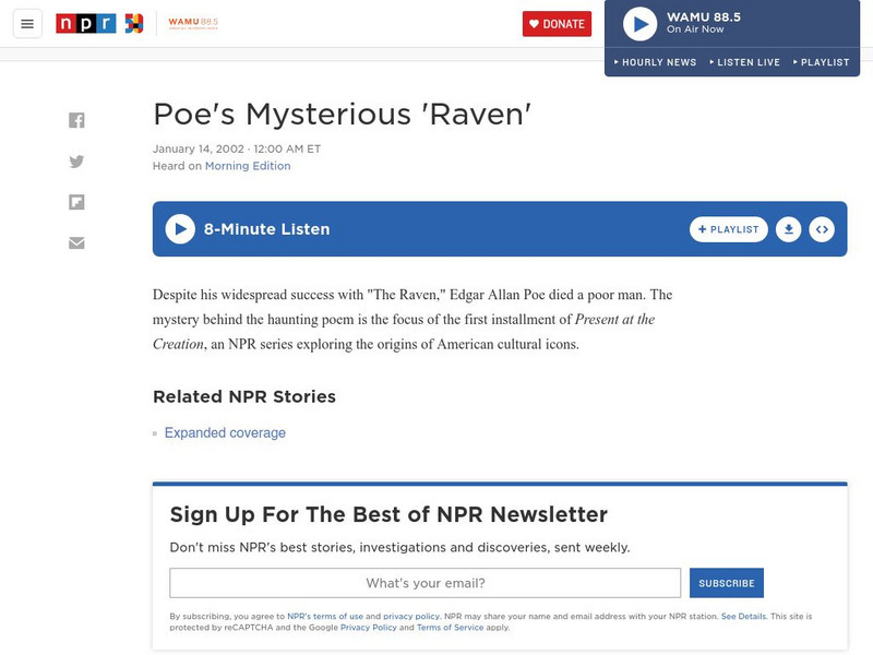 NPR offers a thorough look at the writing of, and history of, "The Raven" by Edgar Allen Poe. Here you can listen to a classic recording of "The Raven," as well as listen to the report as it aired on NPR.