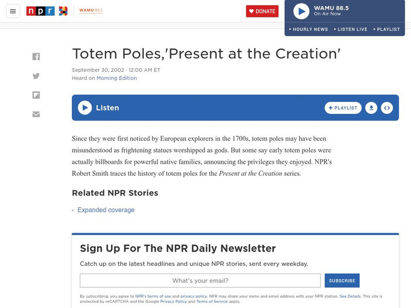 National Public Radio explores the history of the great totem pole carvings created only by Native Americans of the northwestern coasts of North America.