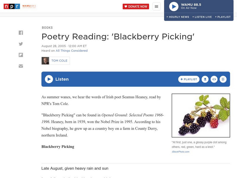Tom Cole, an editor on NPR's Arts Desk, shares the words of the Irish poet Seamus Heaney from the poem entitled "Blackberry Picking" [02:21]. This poem is part of Seamus Heaney's book of collected poetry called Opened Ground: Selected...
