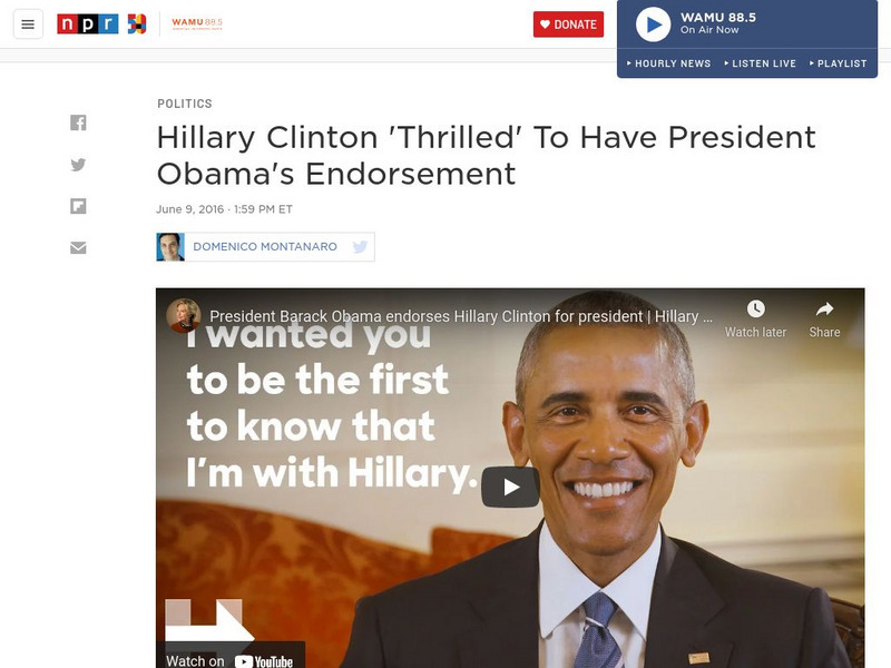 Two days after Hillary Clinton secured enough delegates to be the presumptive nominee of the Democratic Party, President Obama endorsed Clinton on Thursday in a video. The two will campaign together next week in Wisconsin."I want to...