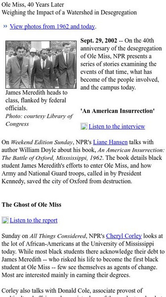 Listen to NPR's series on the story of James Meredith's efforts to enter Ole Miss and what the campus is like forty years later.