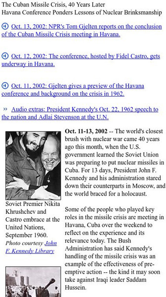 National Public Radio reviews the events leading up to the Cuban Missile Crisis, "The world's closest brush with nuclear war." Hear Kennedy's speech to the nation, see pictures of Kruschev and Castro, and learn about the Havana...