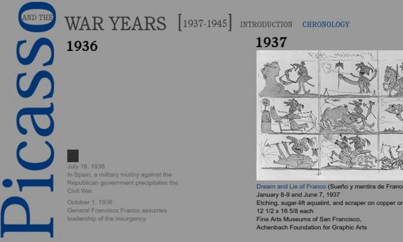 Scrolling timeline of the work Picasso produced during World War II shows off a wide range of Picasso's work interspersed with historical photographs of the war and notes about key events occurring at the time. A compelling way to view...