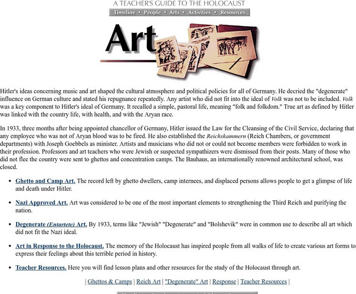 Art and music were not exempt from receiving Hitler's influence during the holocaust. Here you can view Nazi approved art, art considered "degenerate," art from inside the camps and ghettos, and art inspired by the holocaust. This is a...