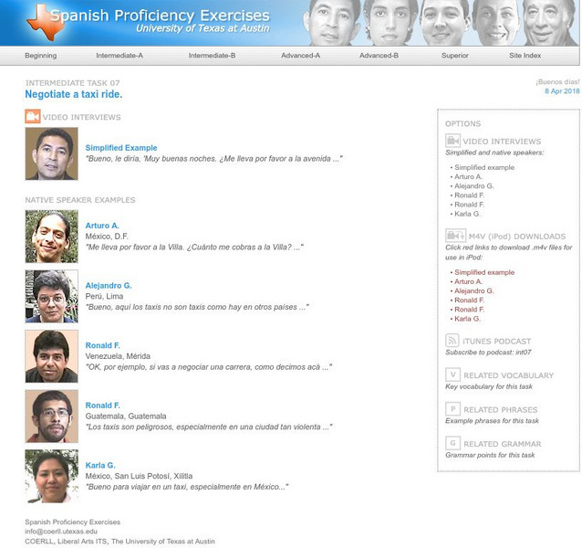 Various listening examples of native speakers in different dialects negotiating and describing taxi rides. Provides a transcript as well so you can read along. Great way to bring native speakers into the classroom and increase vocabulary!
