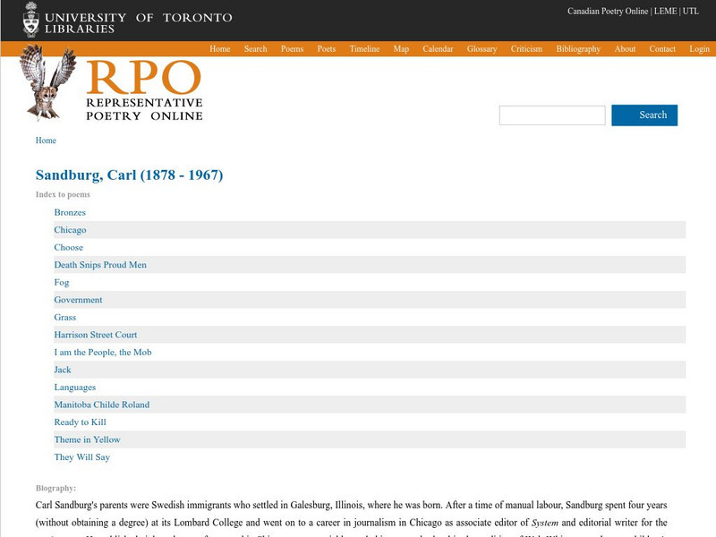 Maintained by the University of Toronto, this site provides an extremely brief biography and a number of Sandburg's poems, including "Chicago," "Fog," Grass," and "They Will Say."