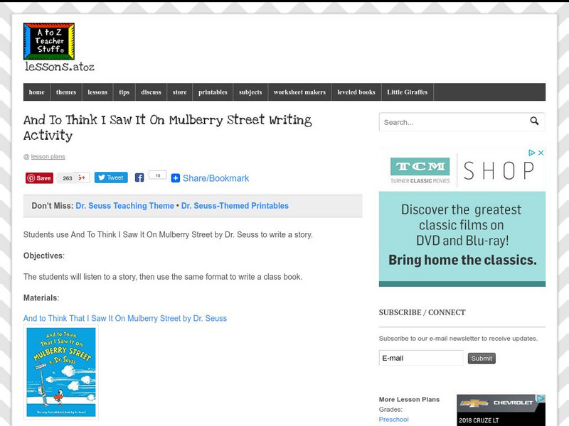 This resource is a lesson plan whose purpose is to create a class book in the style of Dr. Seuss' "And to Think That I Saw it on Mulberry Street."