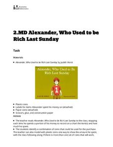 What a great way to incorporate Judith Viorst's story, Alexander, Who Used to Be Rish Last Sunday, with a math lesson on money. Second graders listen to the story being read while the teacher stops to record each time Alexander spends money on an item. Then, young mathematicians use plastic or paper money to explore the possible coin combinations he spent on each item. It is important to emphasize to learners that each combination should be arranged with the smallest number of coins possible. Once figured out, pupils cut out paper coins and item labels and glue them on a poster to display their solutions. A great activity for keepin learners engaged.