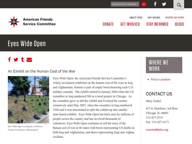 Traveling exhibit that reminds us of the human cost of the Iraq War. This exhibit memorializes those killed in the war with a field of shoes featuring a pair of boots for each U.S. military casualty. Also includes a memorial to Iraqi civilians who have lost their lives and an extensive list of resources for both students and teachers.