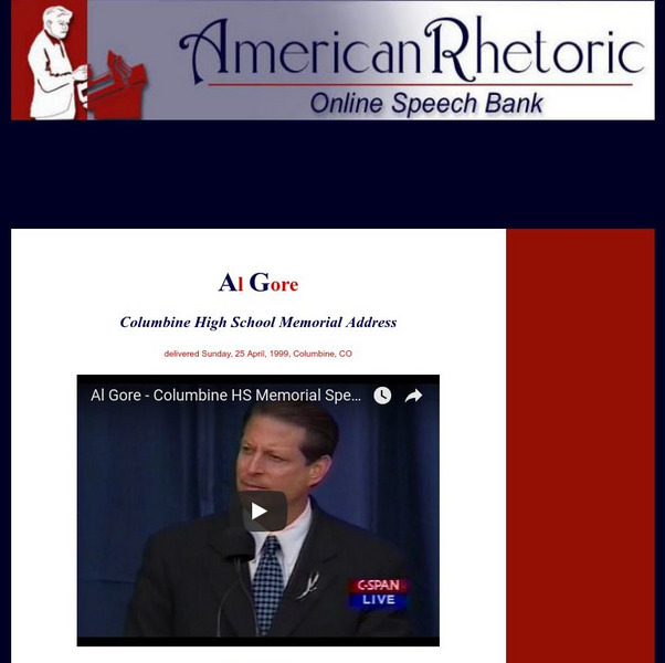 This is the text, audio, and video of the Columbine High School memorial address delivered by Al Gore on April 25, 1999, in Columbine, Colorado, following the shootings and deaths at Columbine High School.