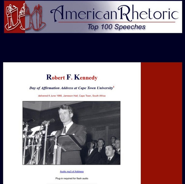 This is the audio mp3 and text of Robert F. Kennedy's speech on June, 6, 1966 on the occasion of Affirmation day for South Africa.