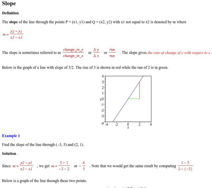 The tutorial examines the slope of a line. Students learn about the mathematics concept through definitions and detailed examples.