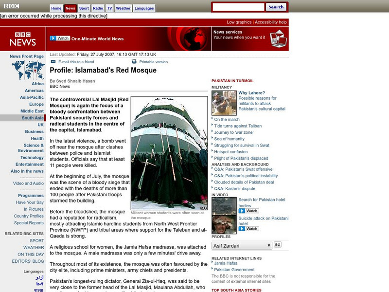 An informative BBC report on the significance of the Islamabad's Red Mosque to Pakistan's Islamic fundamentalist movement. Provides context for understanding the July 2007 siege of the mosque. (7/27/2007)
