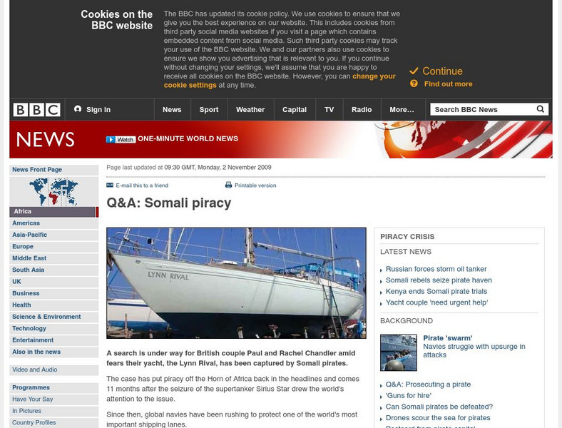 Attacks on ships by Somali pirates has been on a steady rise. Who are the pirates? Why do they resort to hijacking ships? How do they manage to overtake and capture them? Why does it seem impossible to stop them? Does piracy affect people outside Somalia? A map of the region and hot spots for attack are included. (November 2, 2009)