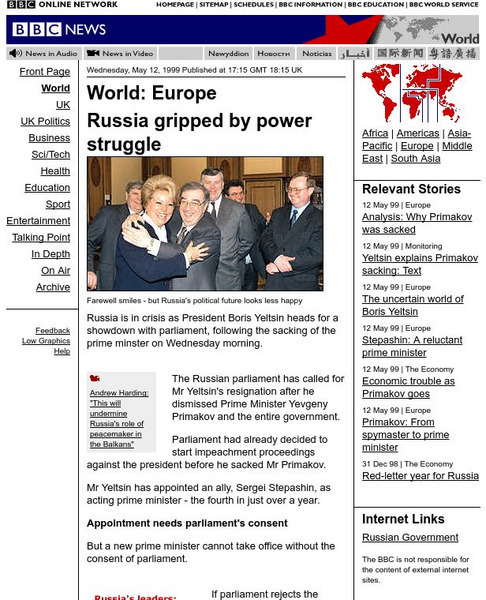 A 1999 news article from the BBC documents the power struggle between Boris Yeltsin and the Russian parliament after Yeltsin dismissed Prime Minister Yevgeny Primakov and the entire government, which in turn was motive for parliament to call for Yeltsin's impeachment.