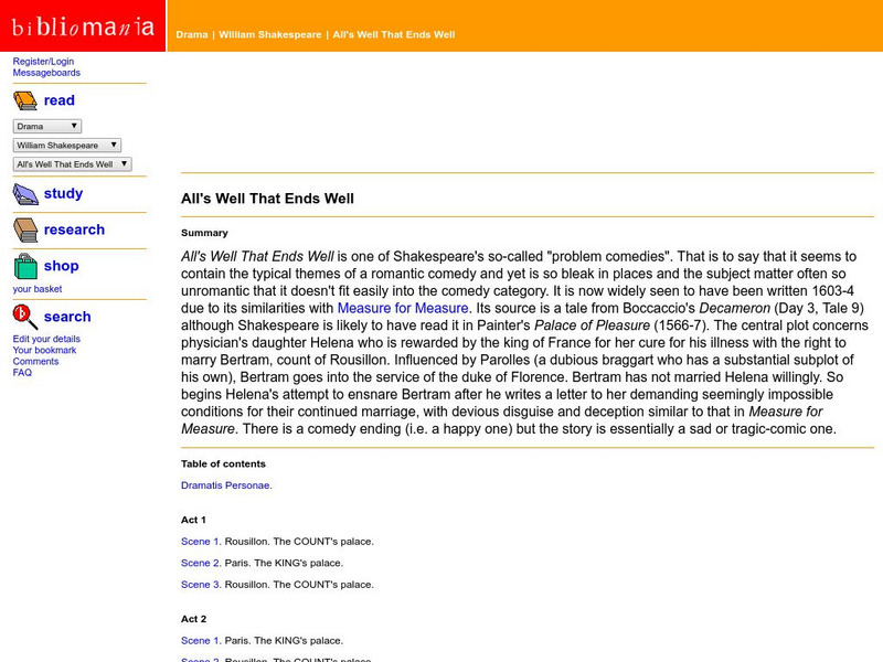 At this website, read a very brief summary of Shakespeare's comedy, "All's Well That Ends Well," and read a full text of the play. Text of play is divided by scenes.