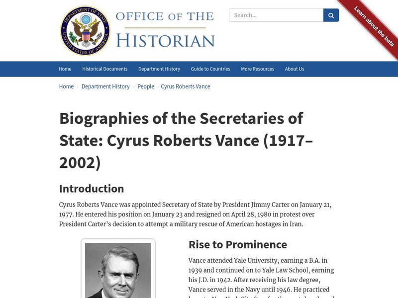 Biogrpahical material on the life and work of Cyrus Vance, a U.S. diplomat and Secretary of State under President Jimmy Carter. Vance is known for his attempts to negotiate with other countries, focussing on human rights in his efforts to avoid military conflict.