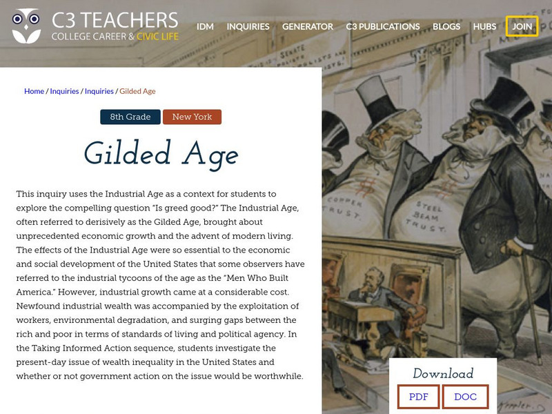 A learning module on the Gilded Age. It includes several supporting questions accompanied by formative tasks and source materials, followed by a summative performance task. Students explore the conditions that fostered industrial growth between 1870 and 1900, and the positive and negative effects of industrialization during that period. The module can be downloaded in PDF or DOC format.