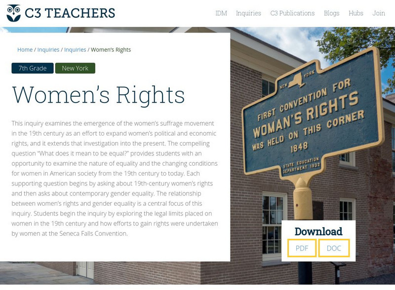 A comprehensive learning module on women's rights that includes three supporting questions accompanied by formative tasks and primary source materials, followed by a summative performance task. Topics covered include the women's suffrage movement, what it means to be an equal member of society, and the evolution of gender equality. The module can be downloaded in PDF or DOC format.