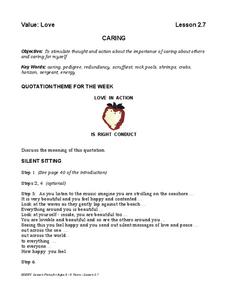 Learners investigate the concept of developing the social skill of caring for others and self. The lesson includes a silent time of reflection on how one can care. Then students read a story that illustrates the concept of caring and then follows with key terms or questions.