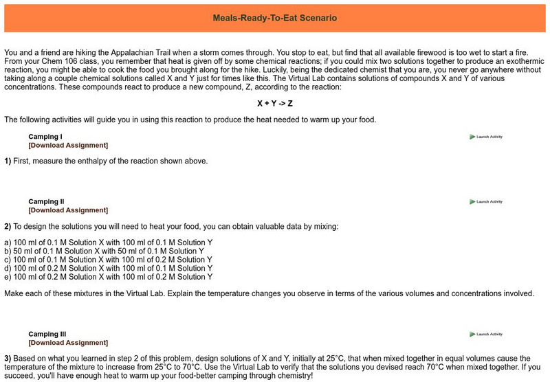 While camping on the Appalachian Trail, a storm dampens all the fire wood and you must design a chemical reaction to heat your meal. In this activity, students design an experiment in the virtual lab to determine the heat of reaction for two substances; they then use this information to create solutions that will produce a temperature change when mixed together. This activity includes virtual lab experiments using automatic grading with feedback.