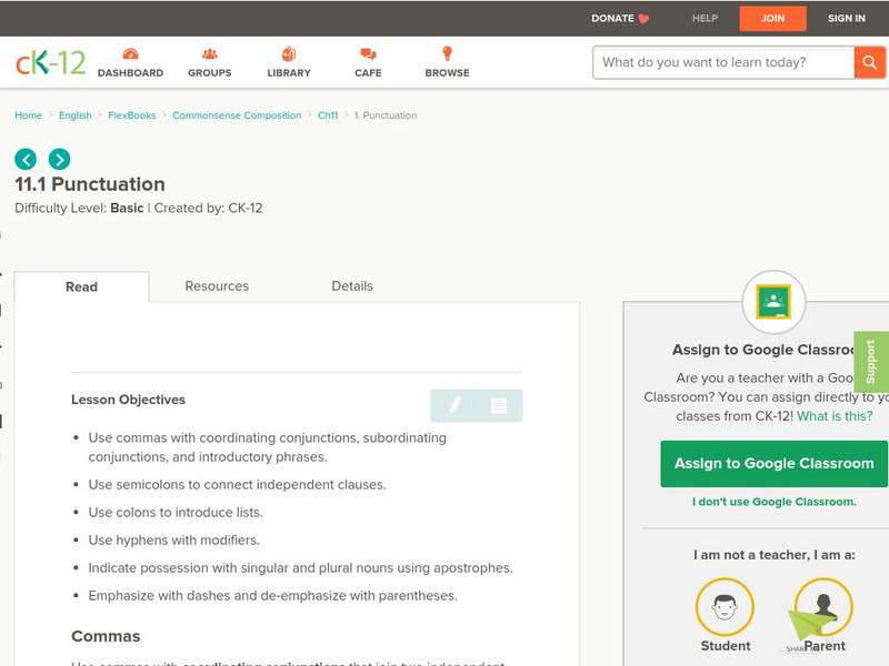 [Free Registration/Login may be required to access all resource tools.] Explanations and examples that demonstrate how to identify and correctly use commas with coordinating conjunctions, subordinating conjunctions, and introductory phrases; semicolons to connect independent clauses; colons to introduce lists; hyphens with modifiers; apostrophes with singular and plural possession; and dashes and parentheses for emphasis. L.9-10.2 Cap/Punc/Spell, L.11-12.2 Cap/Punc/Spell
