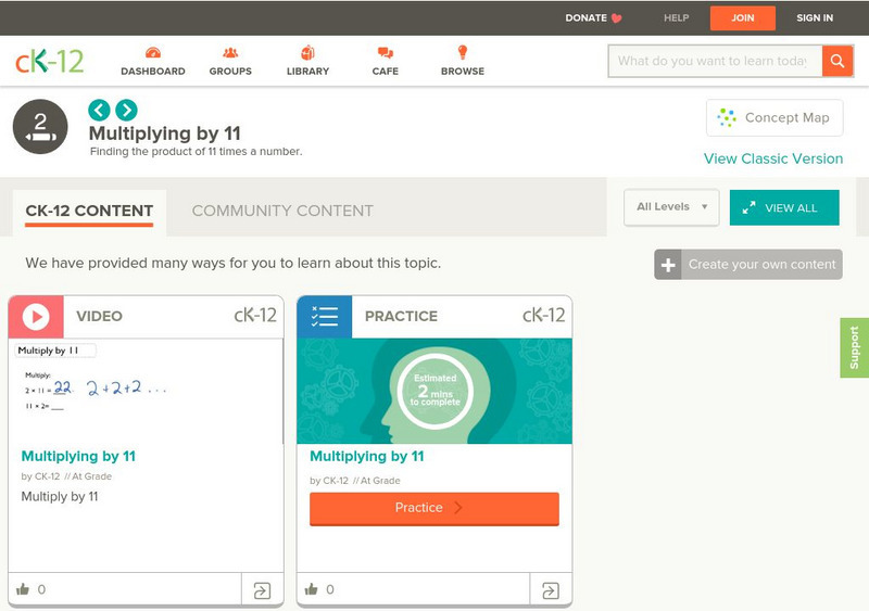 [Free Registration/Login may be required to access all resource tools.] The video describes how to multiply by 11 using repeated addition. The video is followed by a series of practice questions to assess student comprehension of the concept.