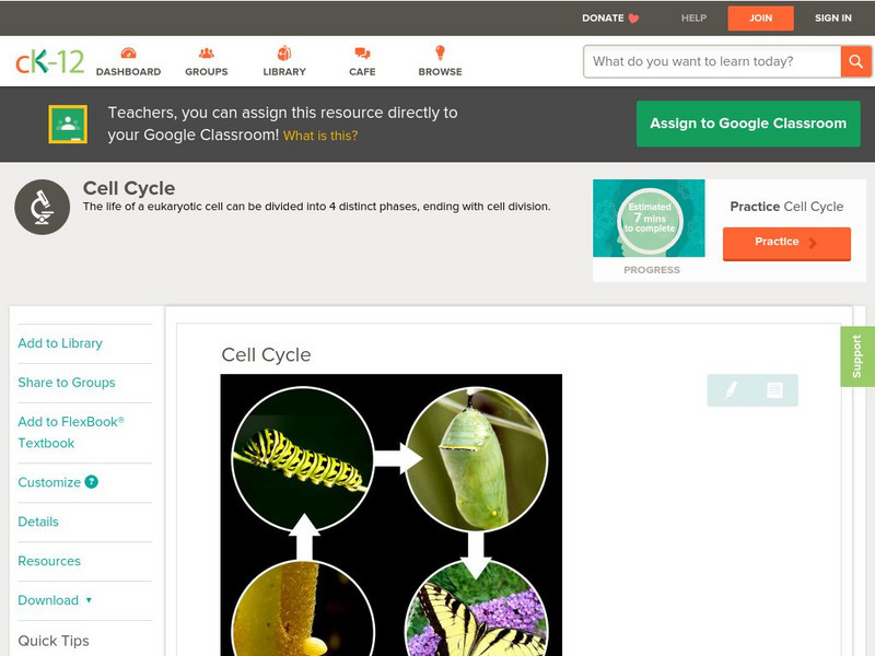 [Free Registration/Login may be required to access all resource tools.] The process of cell division in eukaryotic cells is carefully controlled. The cell cycle is the life cycle of a cell, with cell division at the end of the cycle. Like a human life cycle, which is made up of different phases, like childhood, adolescence, and adulthood, the cell cycle also occurs in a series of phases. Learn more about the cell cycle in this learning module produced by CK-12.