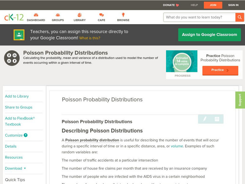 [Free Registration/Login may be required to access all resource tools.] This Concept introduces students to the Poisson probability distribution.