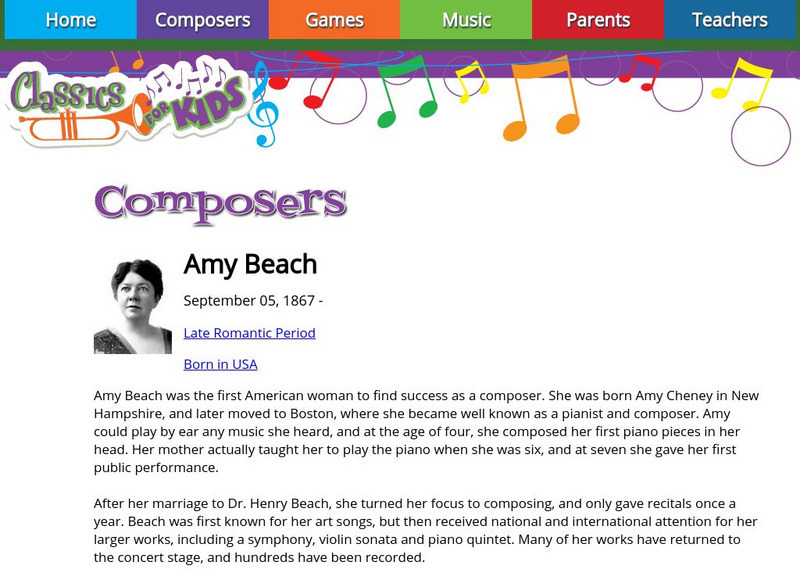 Classics For Kids provides a short biography of Late Romantic composer Amy Beach, born on September 5, 1867.