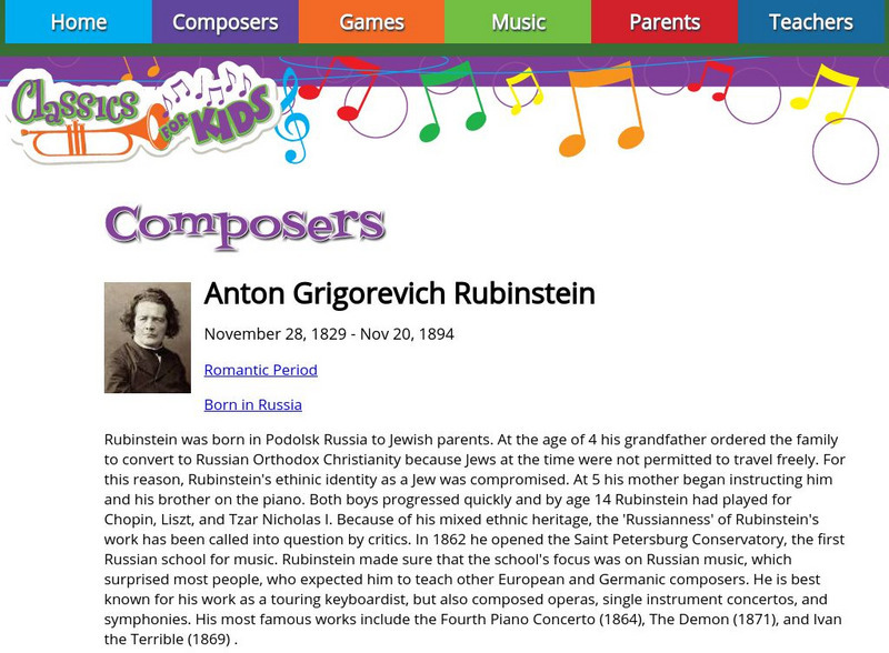 Classics For Kids provides a short biography of Romantic composer Anton Grigorevich Rubinstein, born on Nov 28, 1829.