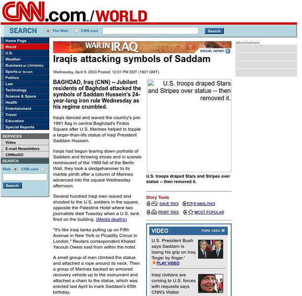 CNN's account of the fall of Baghdad during the Iraq War and the toppling of the statue of Saddam Hussein in the center square of the city.