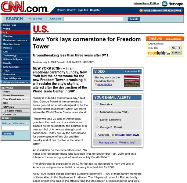 CNN web-article about the construction of the Freedom Tower. Read about the ground breaking ceremony at Ground Zero and the the plans for the new tower.