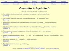 In this comparative and superlative adjectives worksheet, students read the sentences about adjectives and click the answer button to see the correct answer. Students complete 8 problems.