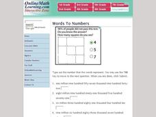 For this converting words to numbers interactive worksheet, 6th graders enter the numbers for 10 number words (each 7 digits long). Students will receive immediate online feedback when they submit their answers.