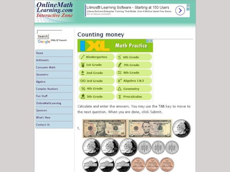 In this counting money worksheet, students count coins and bills up to $10 in each problem. Students complete 10 problems total on this worksheet.