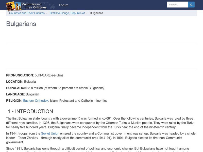 Provides an overview of the traditional culture and lifestyle of Bulgarians. Gives basic facts about location, language, folklore, foods, social customs, family life, education, religion, pastimes, societal challenges, etc. (Note: Content is not the most current.)