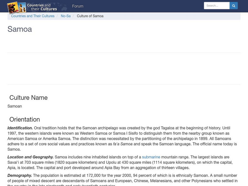 samoan, world culture encyclopedia: world cultures: culture of samoa, architecture of samoa, childhood in samoa, demography of samoa, economy of samoa, education in samoa, family life in samoa, geography of samoa, history of samoa, languages of samoa, politics of samoa, religions of samoa, social stratification in samoa, symbols of samoa, samoa