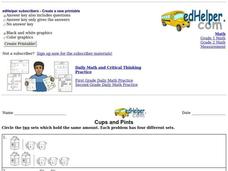 In this measurements learning exercise, students study the capacity and circle the 2 sets which hold the same amount. Students solve 4 problems.
