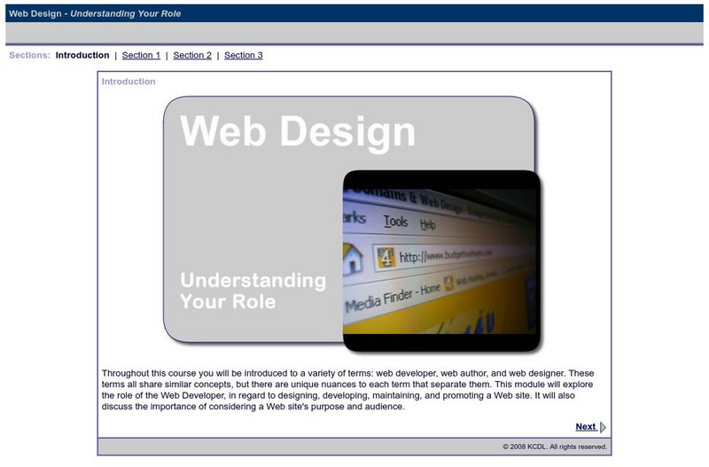 In Module 1 of this course on web design, students look at how web content is delivered to a user and the path structure of files and folders. They learn what the role of a web developer is and the job requirements and salary levels. They also look at the different types of websites and audiences.