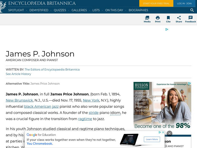 This entry from Encyclopedia Britannica features James P. Johnson, a highly influential black American jazz pianist who also wrote popular songs and composed classical works. A founder of the stride piano idiom, he was a crucial figure in the transition from ragtime to jazz.