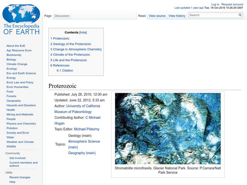 Article describing the Proterozoic Eon, which lasted from 2.5 billion to 543 million years ago. It covers the subdivisions of the Proterozoic Eon, geology, Earth's atmosphere at the time, climate, and life forms. (Published: July 26, 2010)