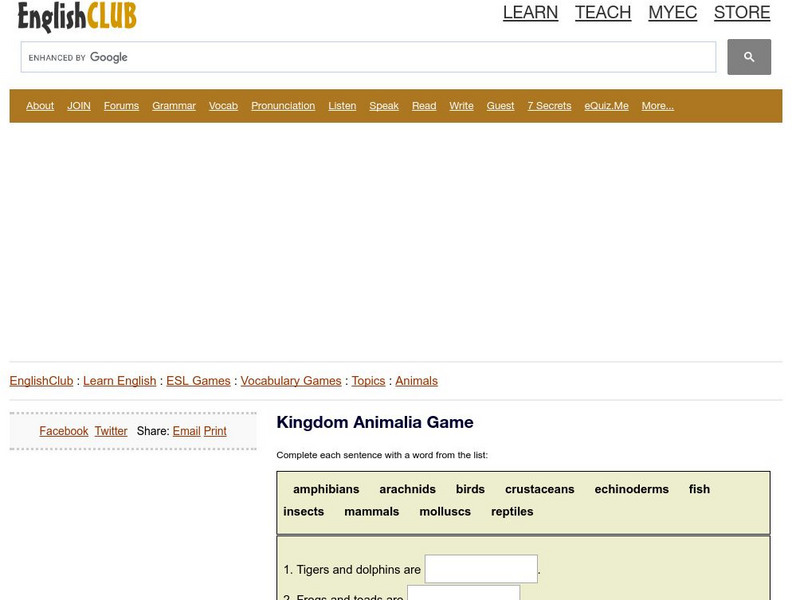 Choose from a word bank to complete ten sentences about animal kingdoms. Hints are available if needed, and a percentage score is displayed once answers are submitted.
