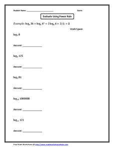 In this logarithm worksheet, students evaluate five logarithms using the power rule. Work Space and solutions are provided.