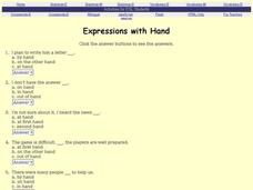 In this expressions with hand worksheet, students fill in the blanks to sentences with the correct expressions with the word hand in them. Students complete 10 problems total.