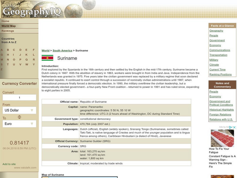 After reading a brief introduction on Suriname, you can learn many enlightening facts about the country through "Facts at a Glance". For more detailed information, take a look at the notes and commentary section.