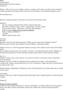Young scholars explore the Japanese literature, music and art. Pupils discuss the culture of Japan. While listening to Japanese music, they write and illustrate a Haiku. Students are given the opportunity to create origami.